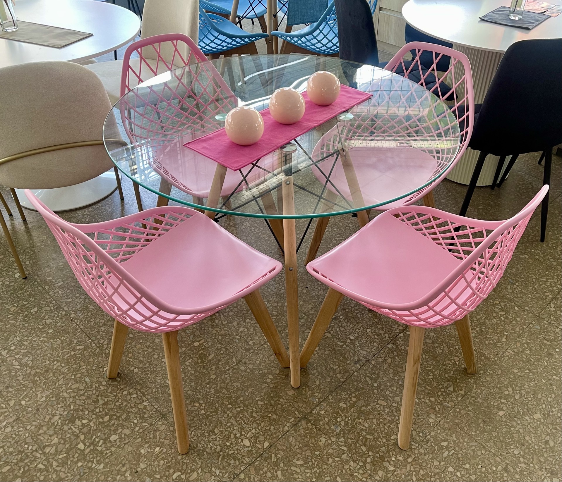 Juego de Mesa Eames 0.90 diam. tapa de vidrio, importada, patas de madera haya.