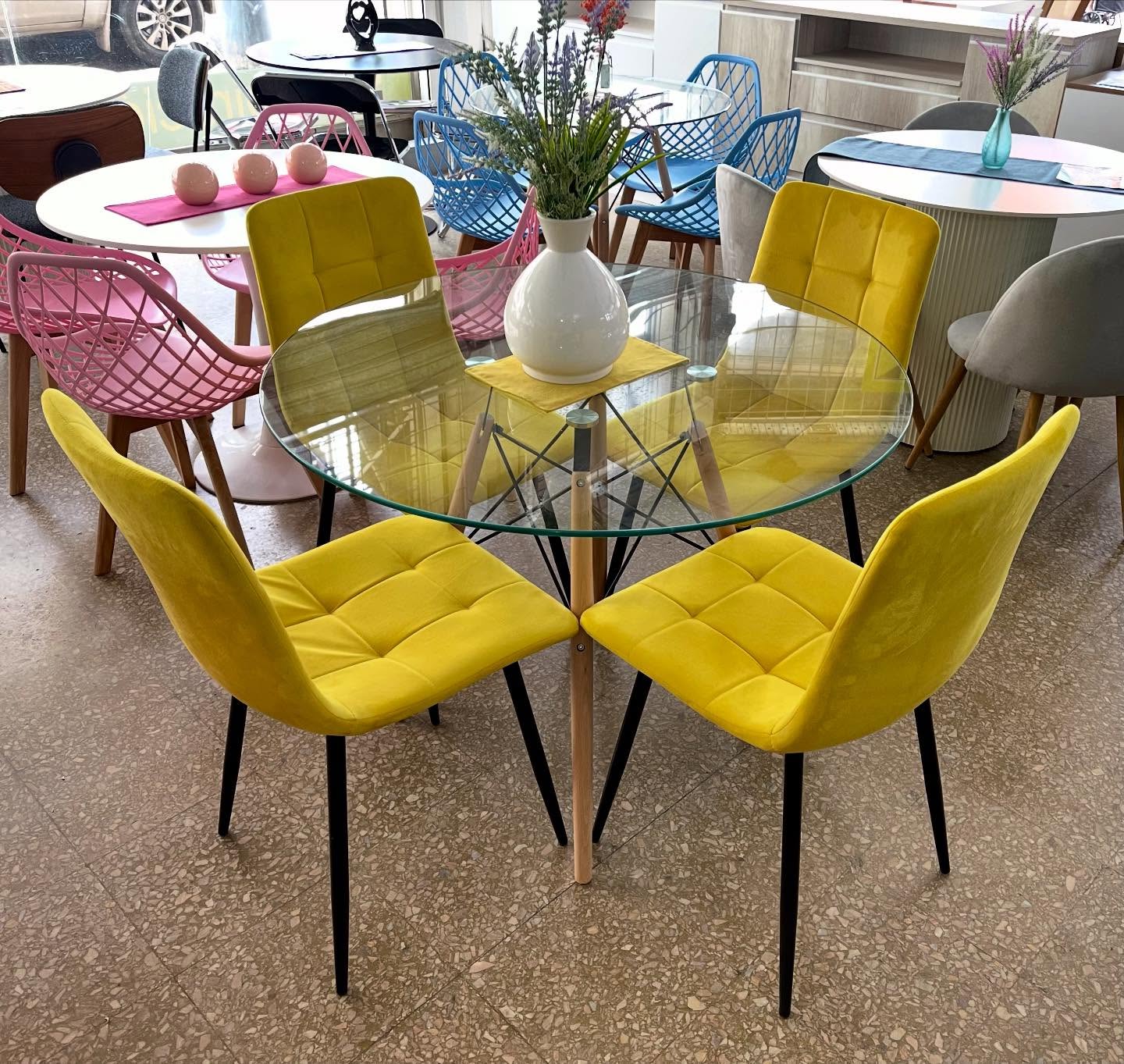 Juego Mesa Eames Vidrio 1.00 diam. + 4 Sillas Venecia Pana Mustard