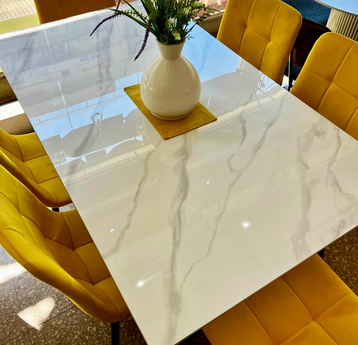 Juego de Mesa Fija Neolith base metálica negra de alta resistencia, patas negras con detalles dorados, importada, tapa de Neolith que aporta facilidad para la limpieza y una durabilidad excepcional, tono simil carrara.