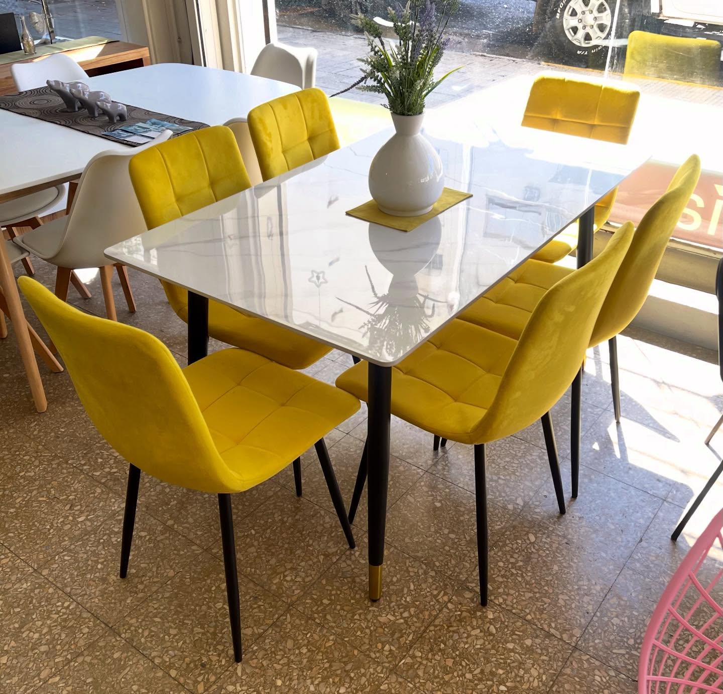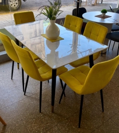 + 6 Sillas Venecia tapizadas en pana mostaza.
