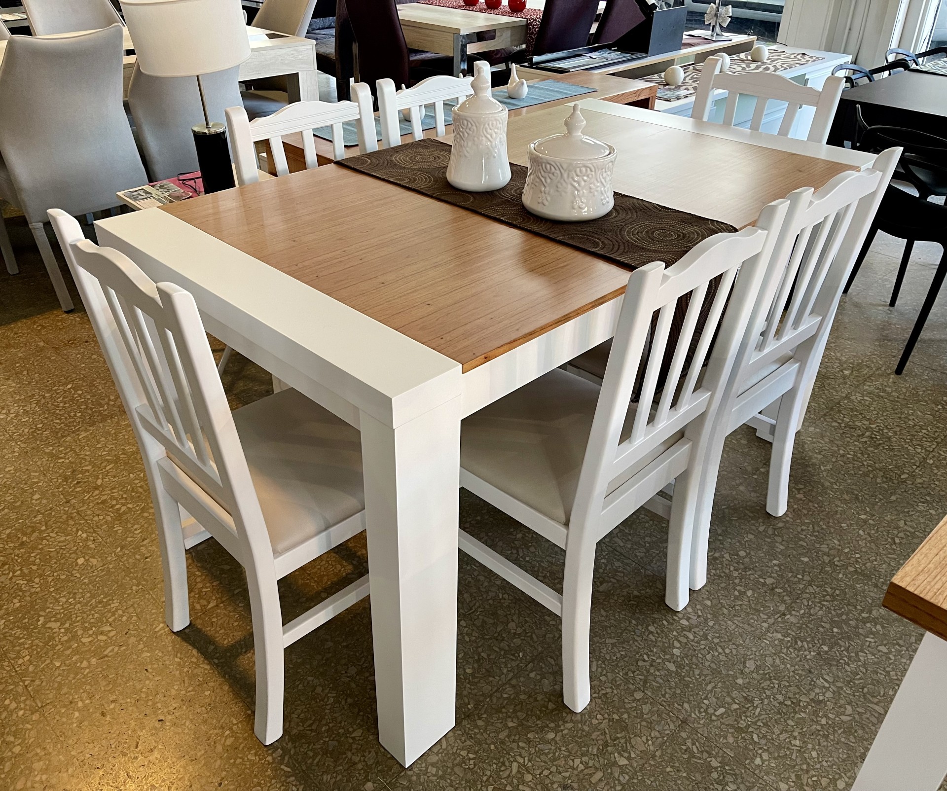Juego de Mesa Itaca 1.60 x 0.90 detalle de paraíso en la tapa, base paraíso laqueada blanco.
