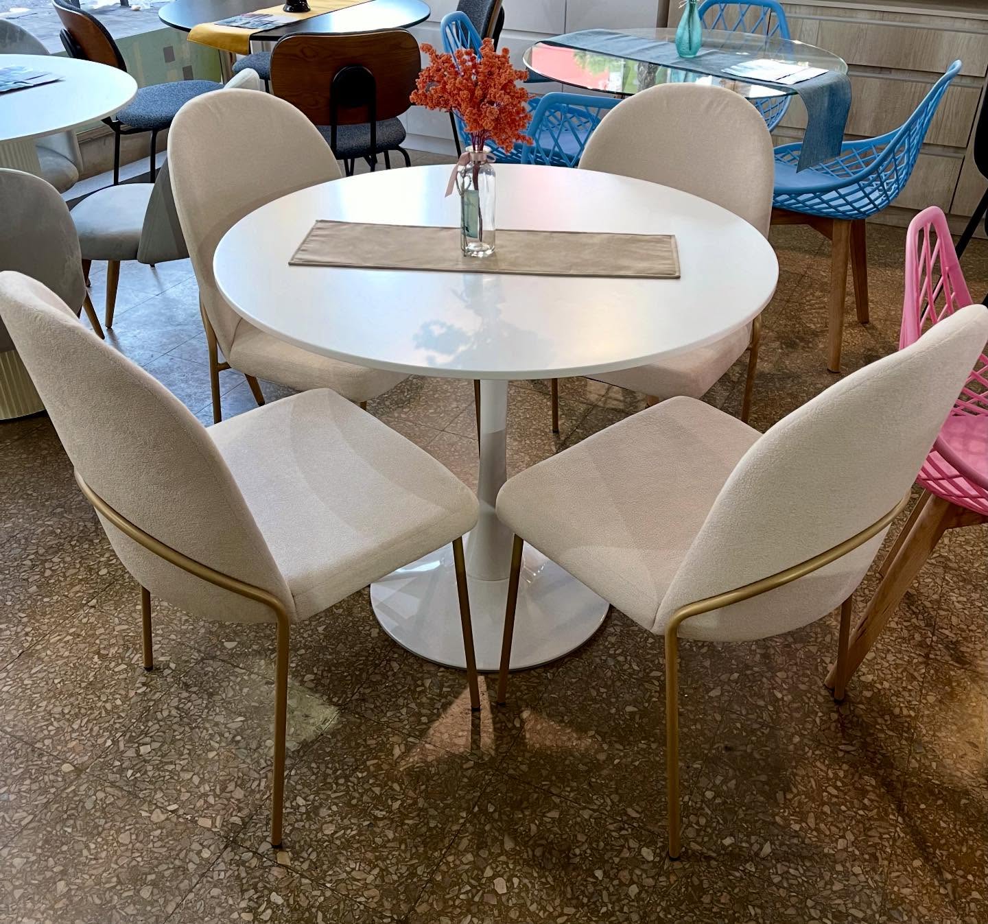 Juego de Mesa Tulip 0.90 diam. base central en metal mate con forma de pedestal, importada, laqueada blanca.