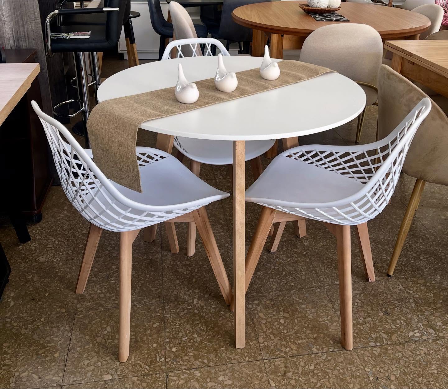 Juego de Mesa Tulip 0.90 diam., importada, tapa laqueada blanca, patas de madera haya.