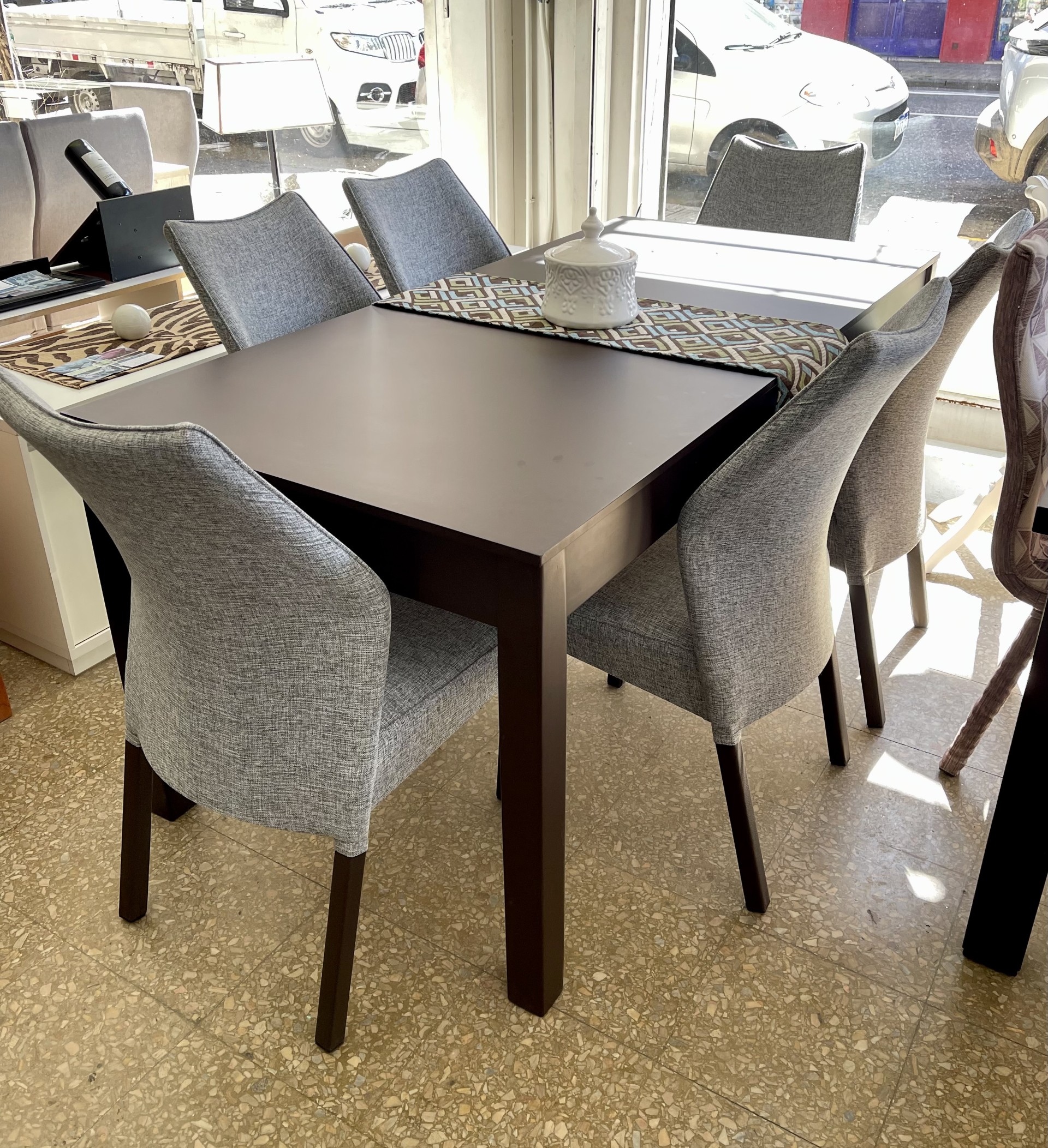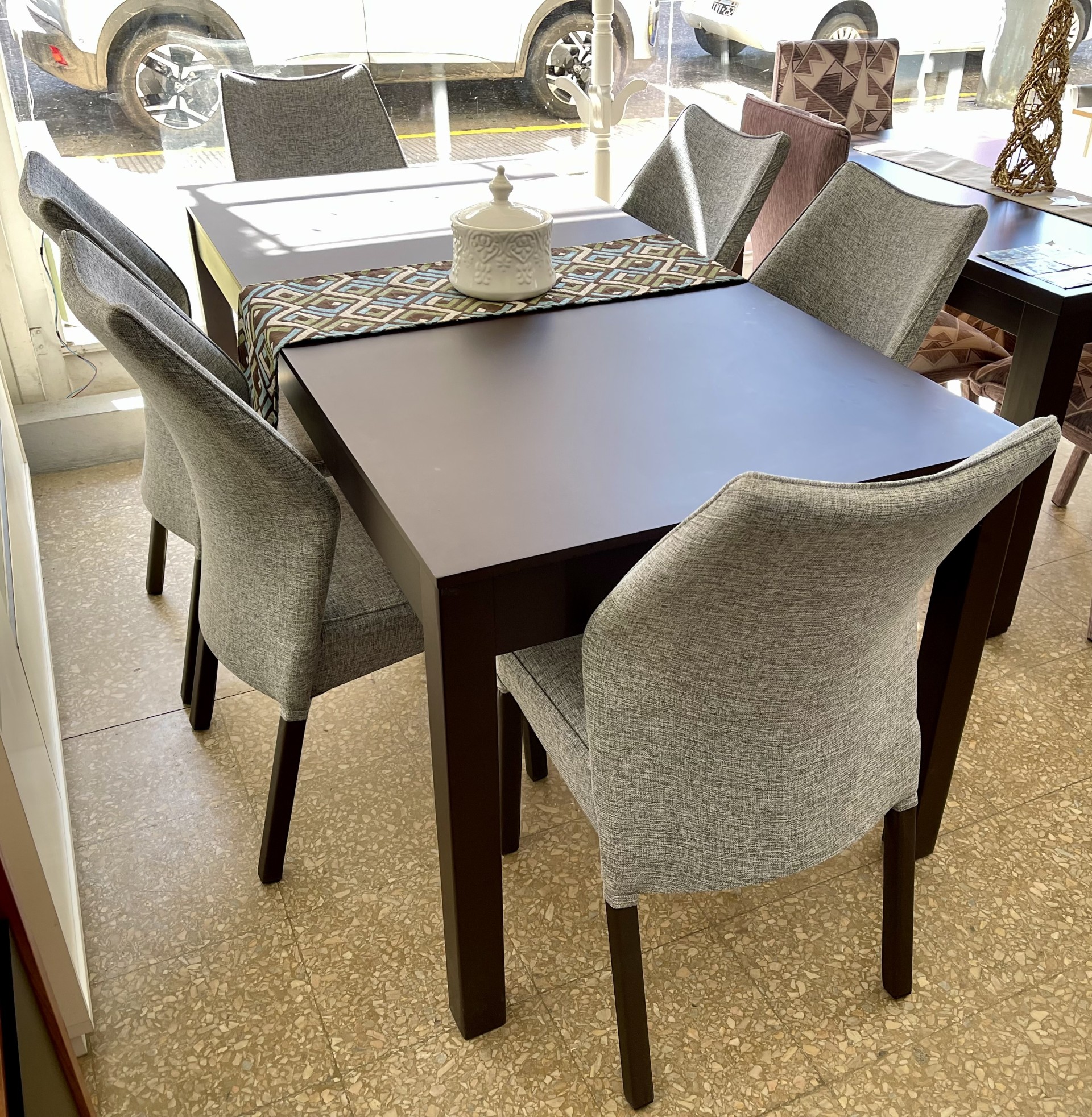 + 6 Sillas Luxor tapizadas en lino gris.