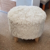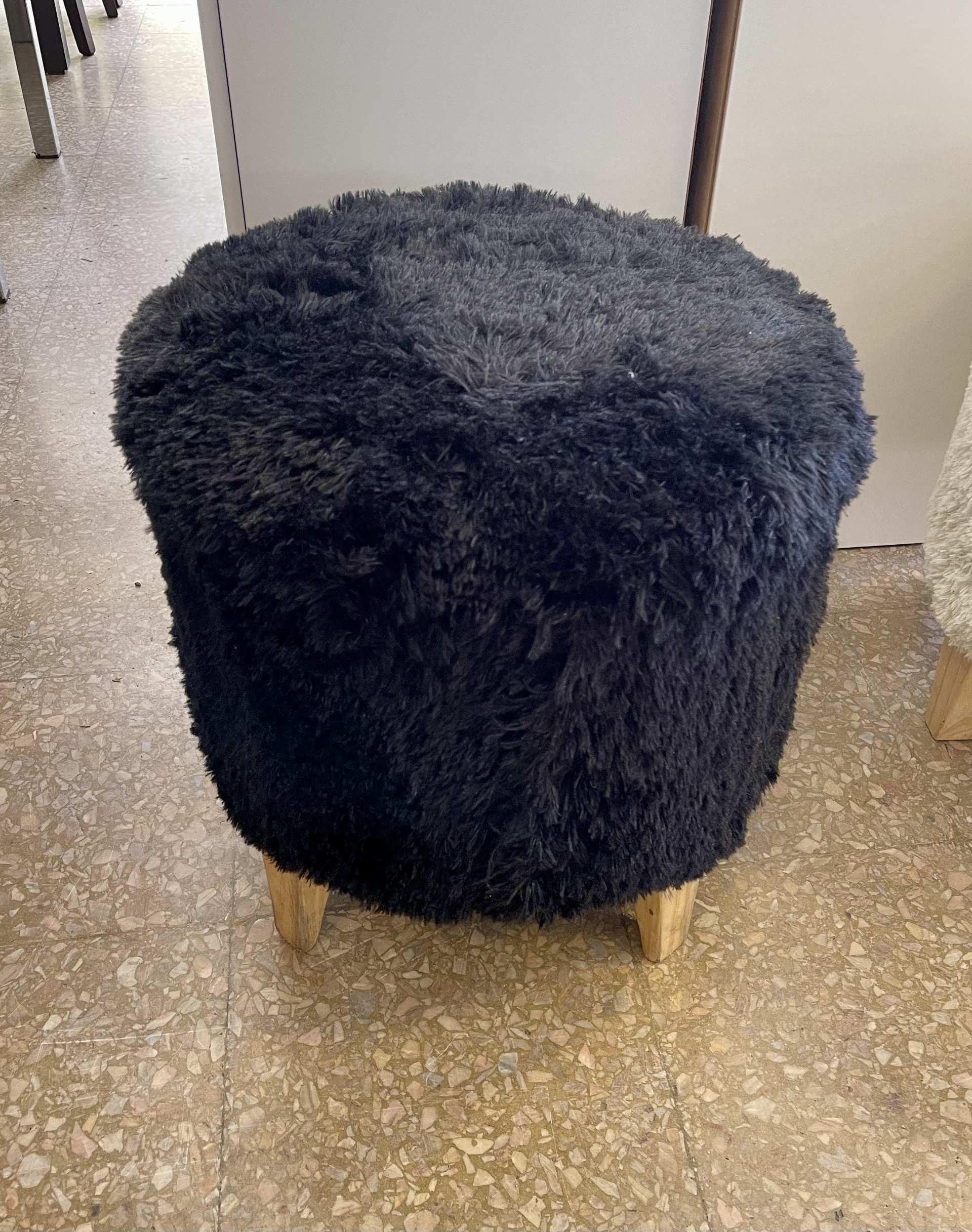 Puff redondo con patas de madera, confeccionado en peluche pelo soft.