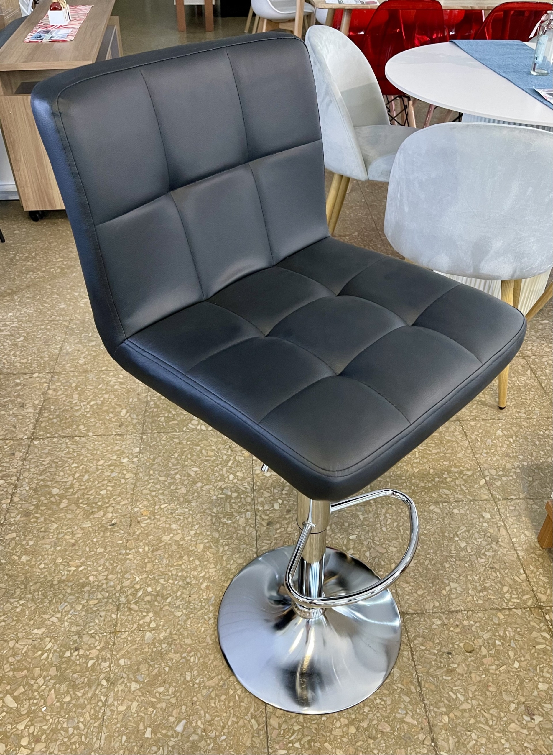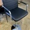 Banqueta Importada con graduación de altura, Tapizada en eco cuero Negro, acolchada, detalles de costura, base cromada.
