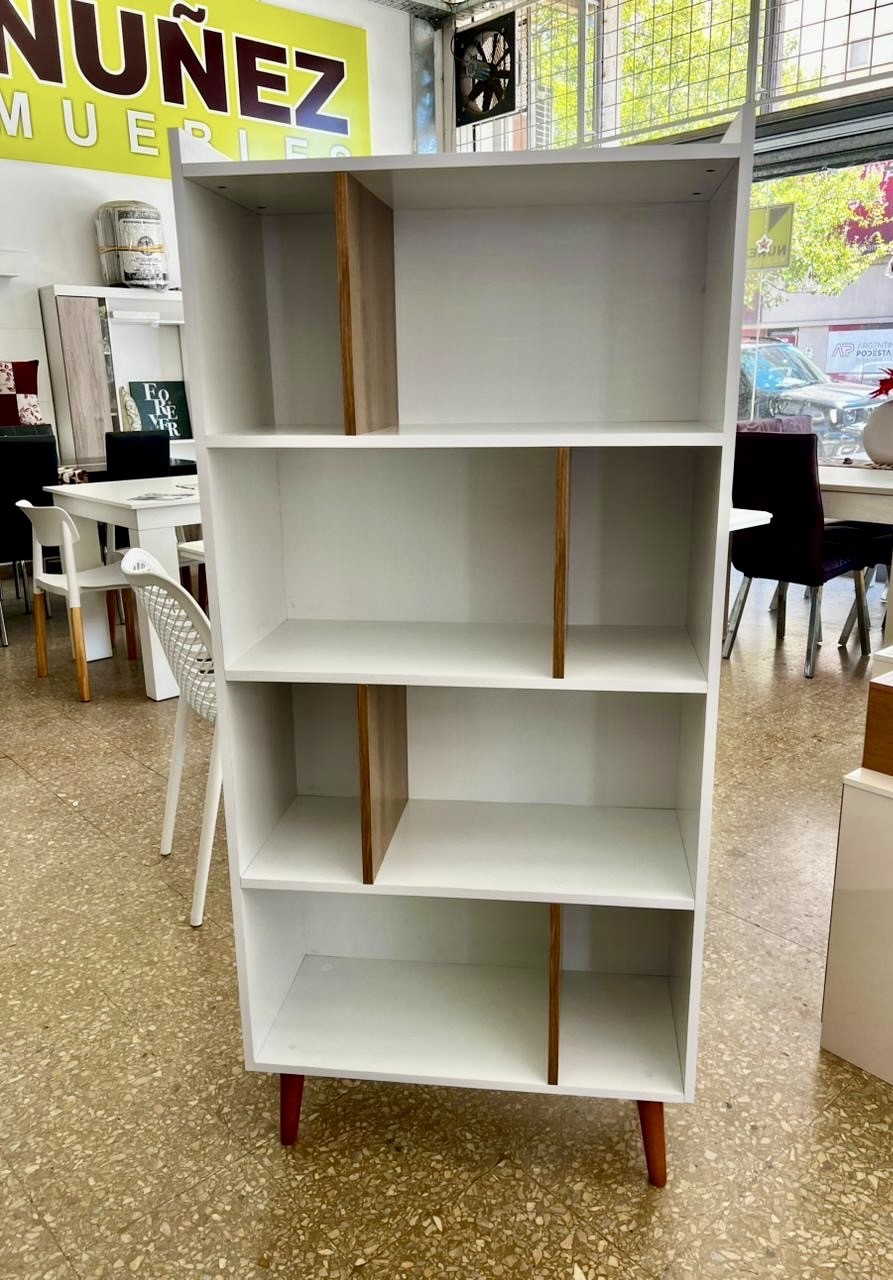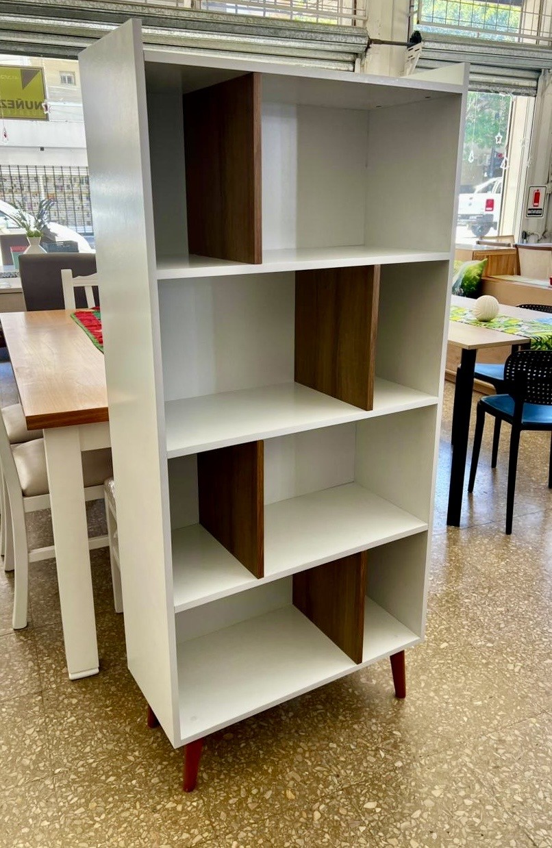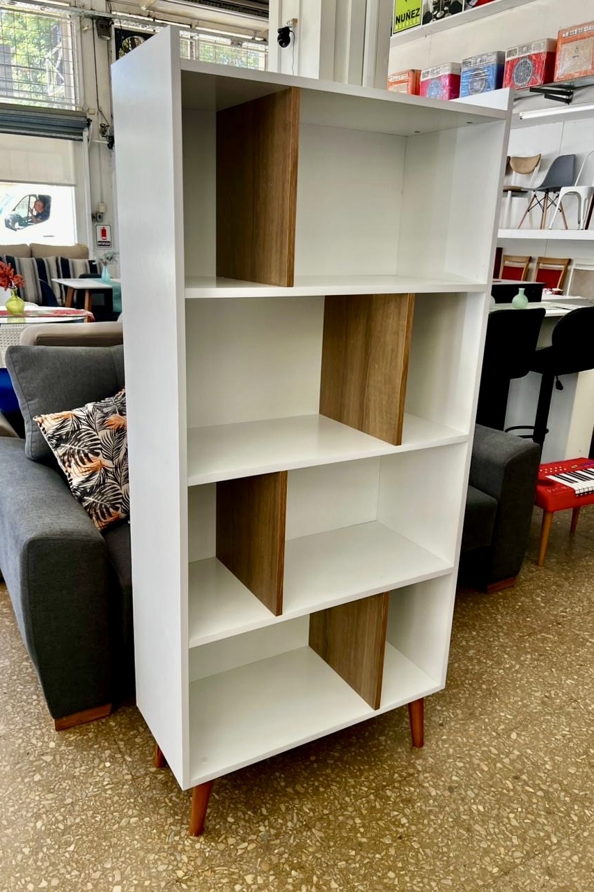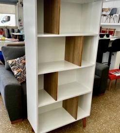 Biblioteca con estantes formato zig zag, confeccionada en mdf laqueado uv blanco/roble, patas de madera.