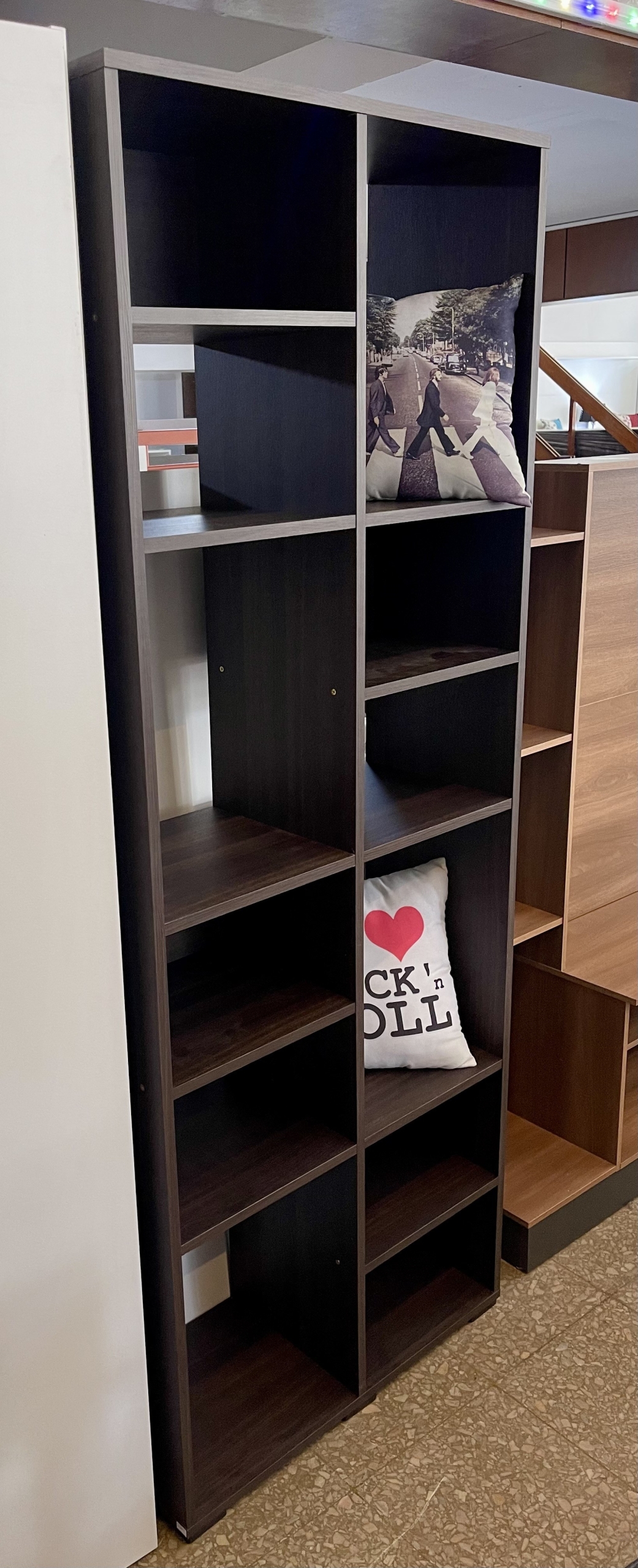 Biblioteca con estantes formato zig zag, confeccionada en melamina wengue.