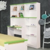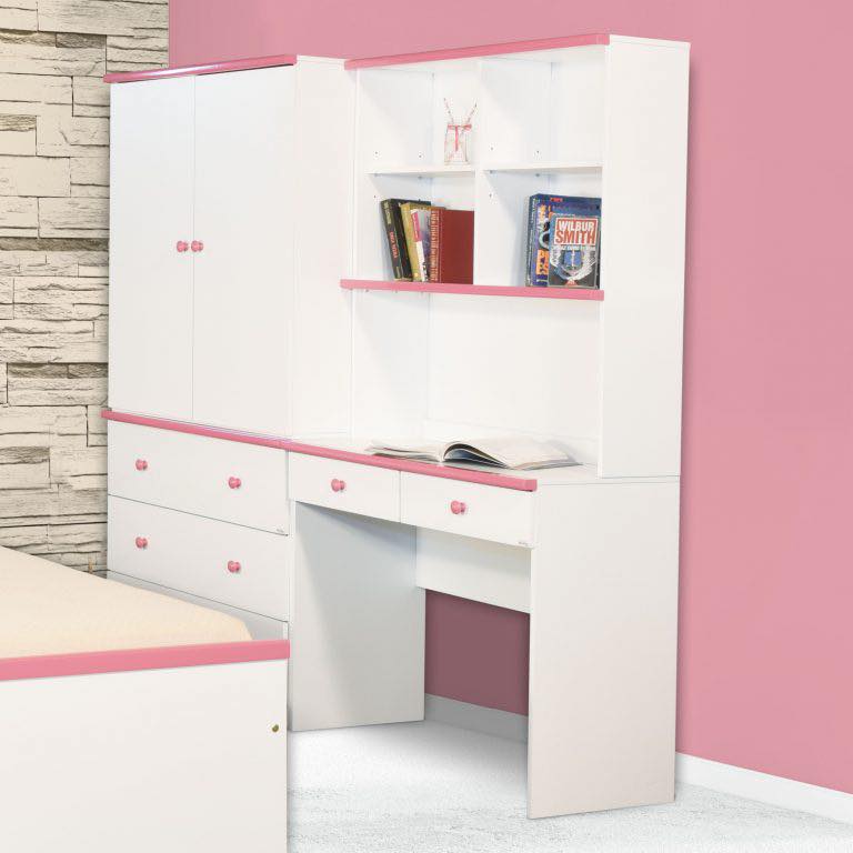 Escritorio Modular Lamby, formado por 2 módulos, módulo derecho con 2 puertas + 3 cajones, módulo central con escritorio 2 cajones con correderas metálicas + alzada, confeccionado en mdf laqueado blanco.