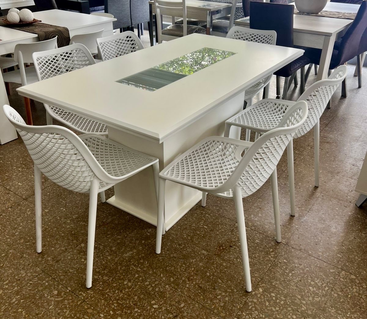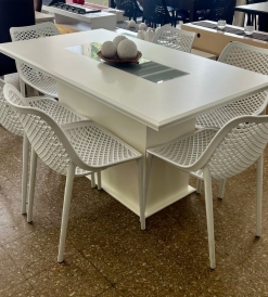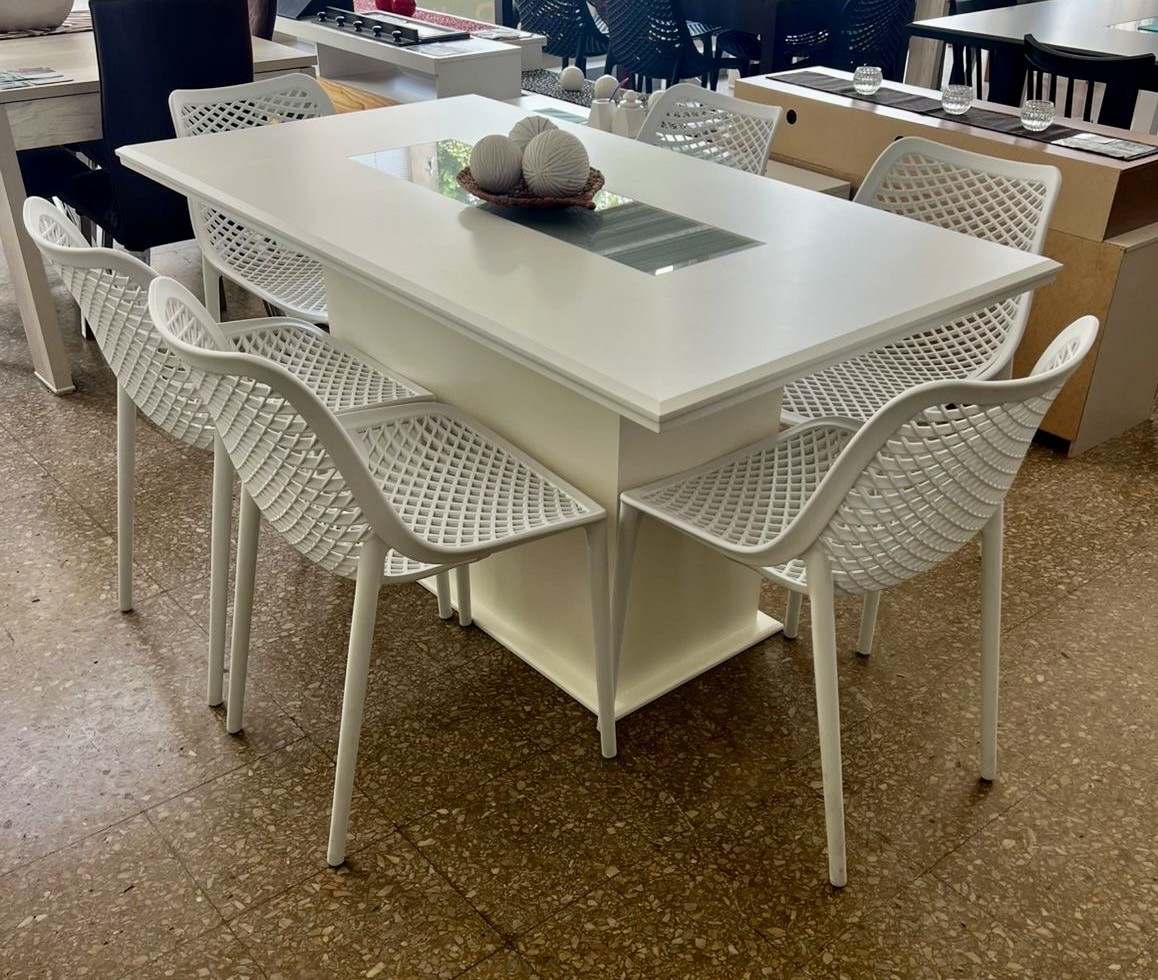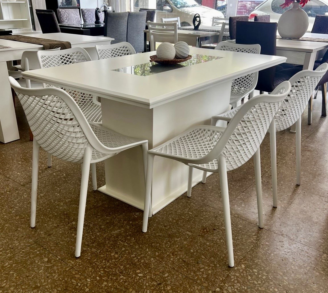 Juego Mesa Base Cubo con Vidrio Blanca 1.60 x 0.90 + 6 Sillas Varesse Blancas