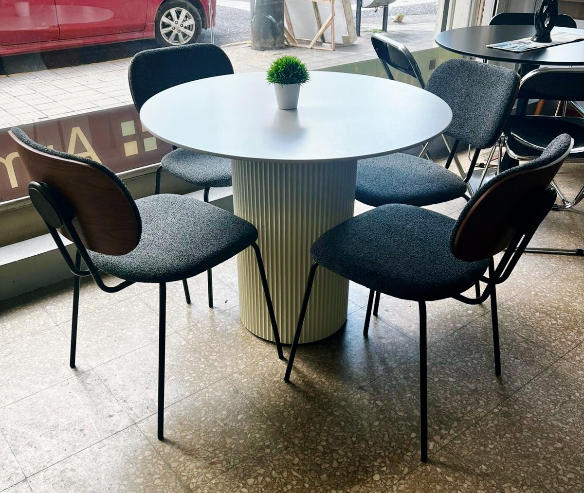 Juego Mesa Circle Blanca 0.90 diam. + 4 Sillas Miller Boucle Gris