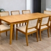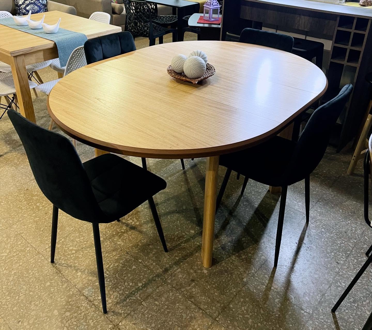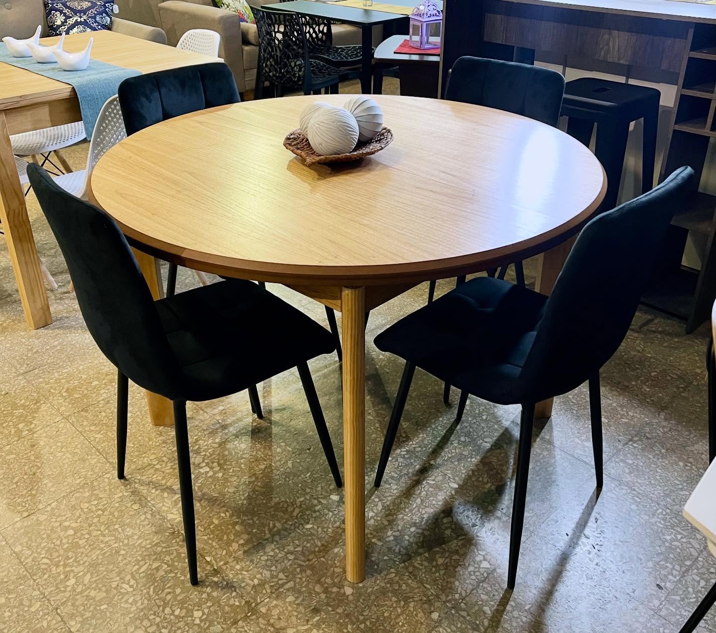 Juego de Mesa Extensible Redonda Paraíso, estructura de paraíso macizo, tapa paraíso, sistema de apertura simple con trampa en el medio, correderas deslizables, lustre natural.