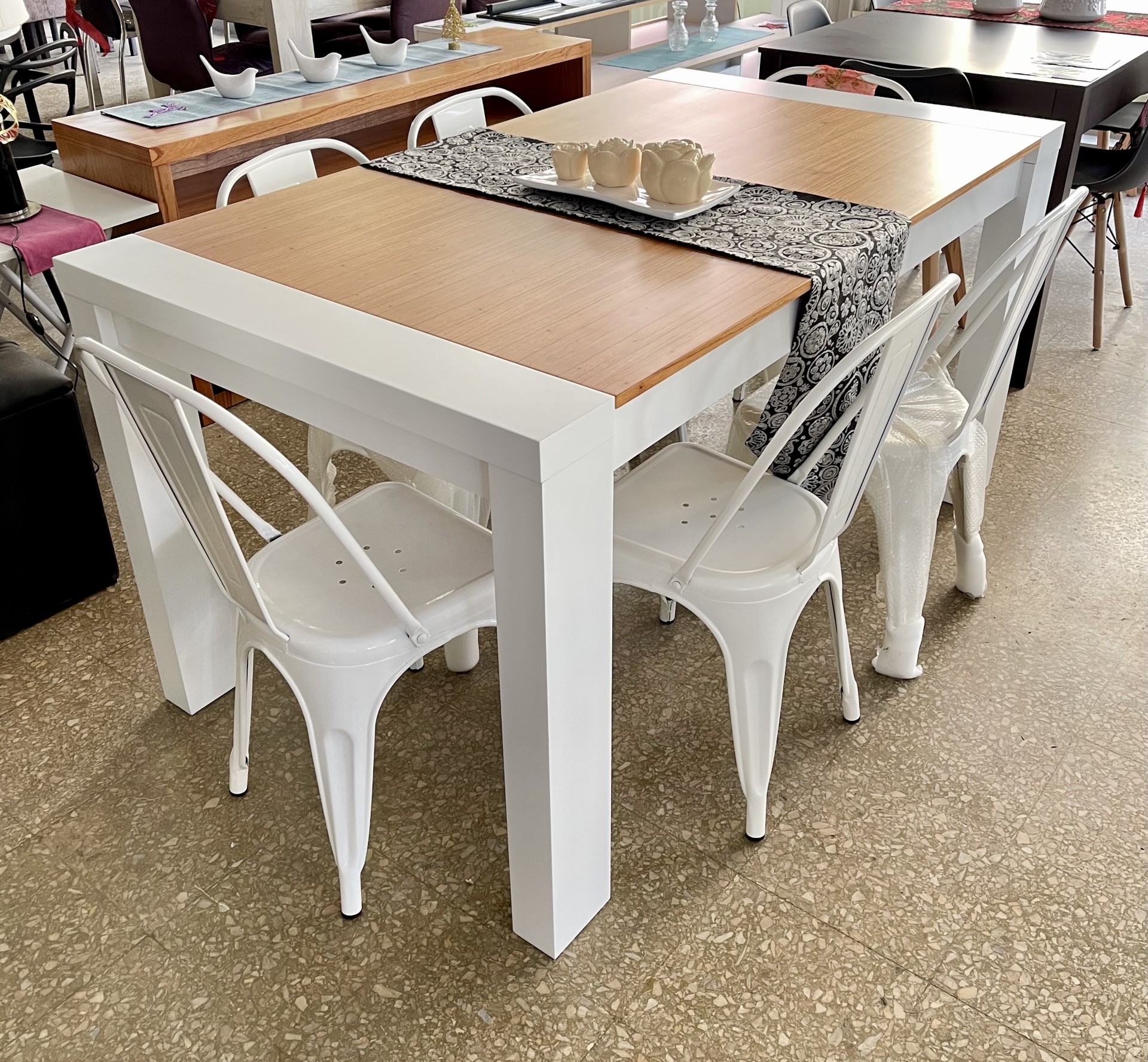 Juego de Mesa Itaca 1.60 x 0.90 detalle de paraíso en la tapa, base paraíso laqueada blanco.