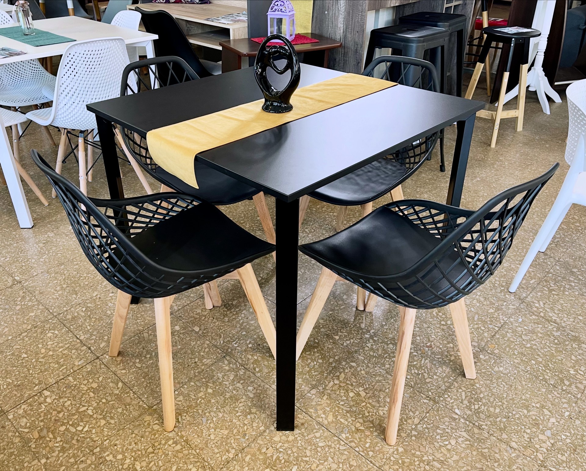 Juego Mesa Milano Negra 0.85 x 0.85 + 4 Sillas Nova Tulip Negras