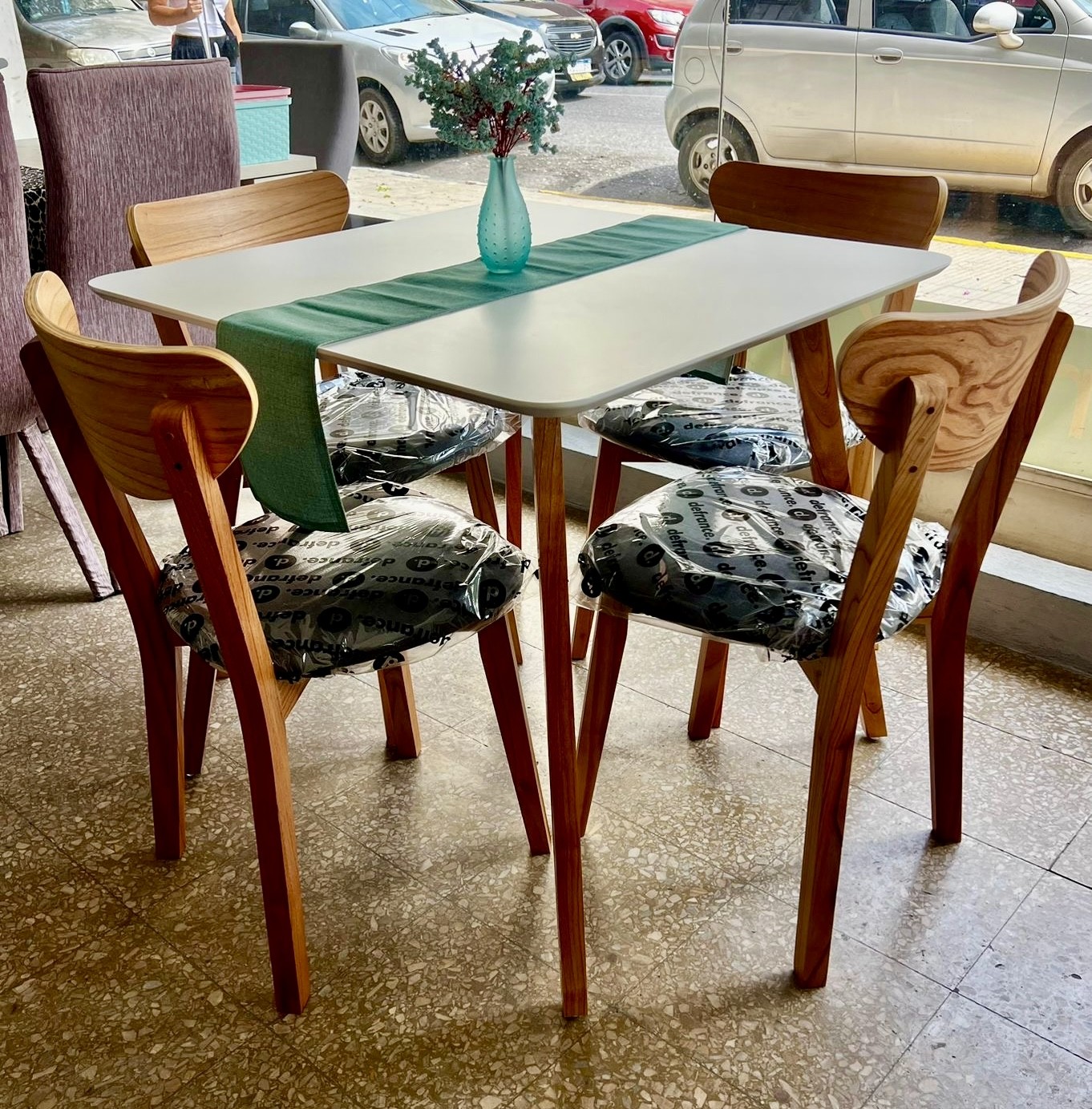 Juego de Mesa Nórdica 0.85 x 0.85 tapa melamina blanca, patas de paraíso.
