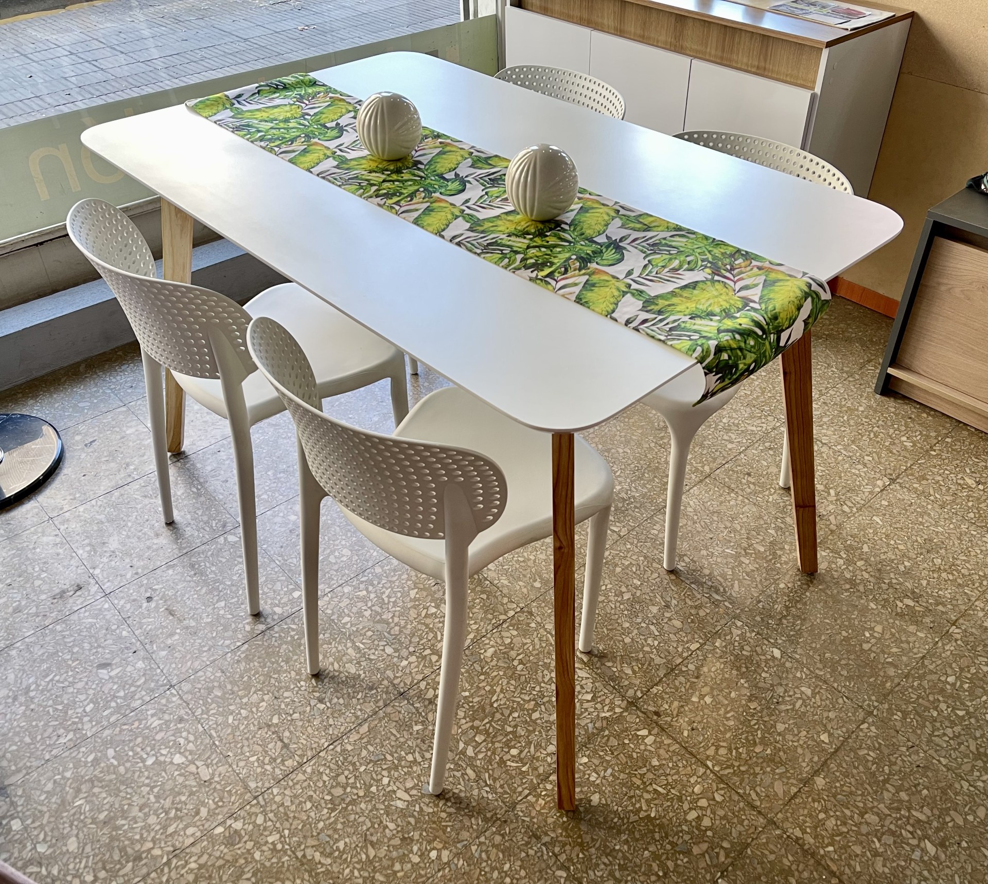 Juego de Mesa Nórdica 1.30 x 0.80 tapa melamina blanca, patas de paraíso.