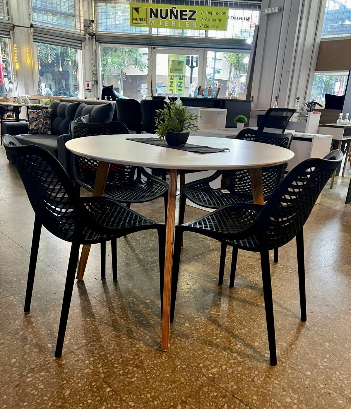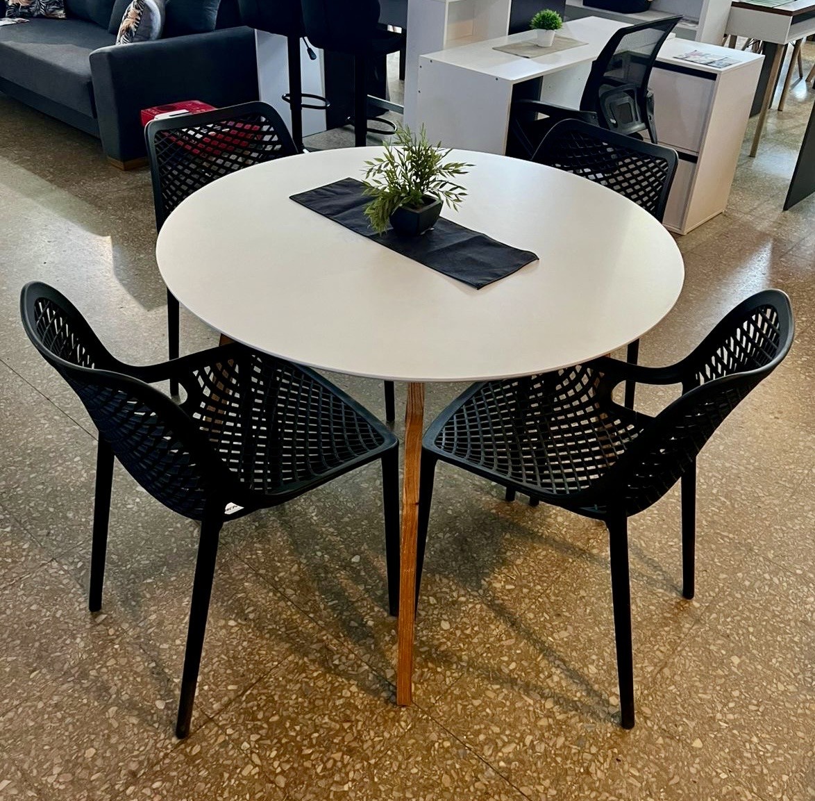 Juego Mesa Nórdica Blanca 1.10 diam. + 4 Sillas Varesse Negras