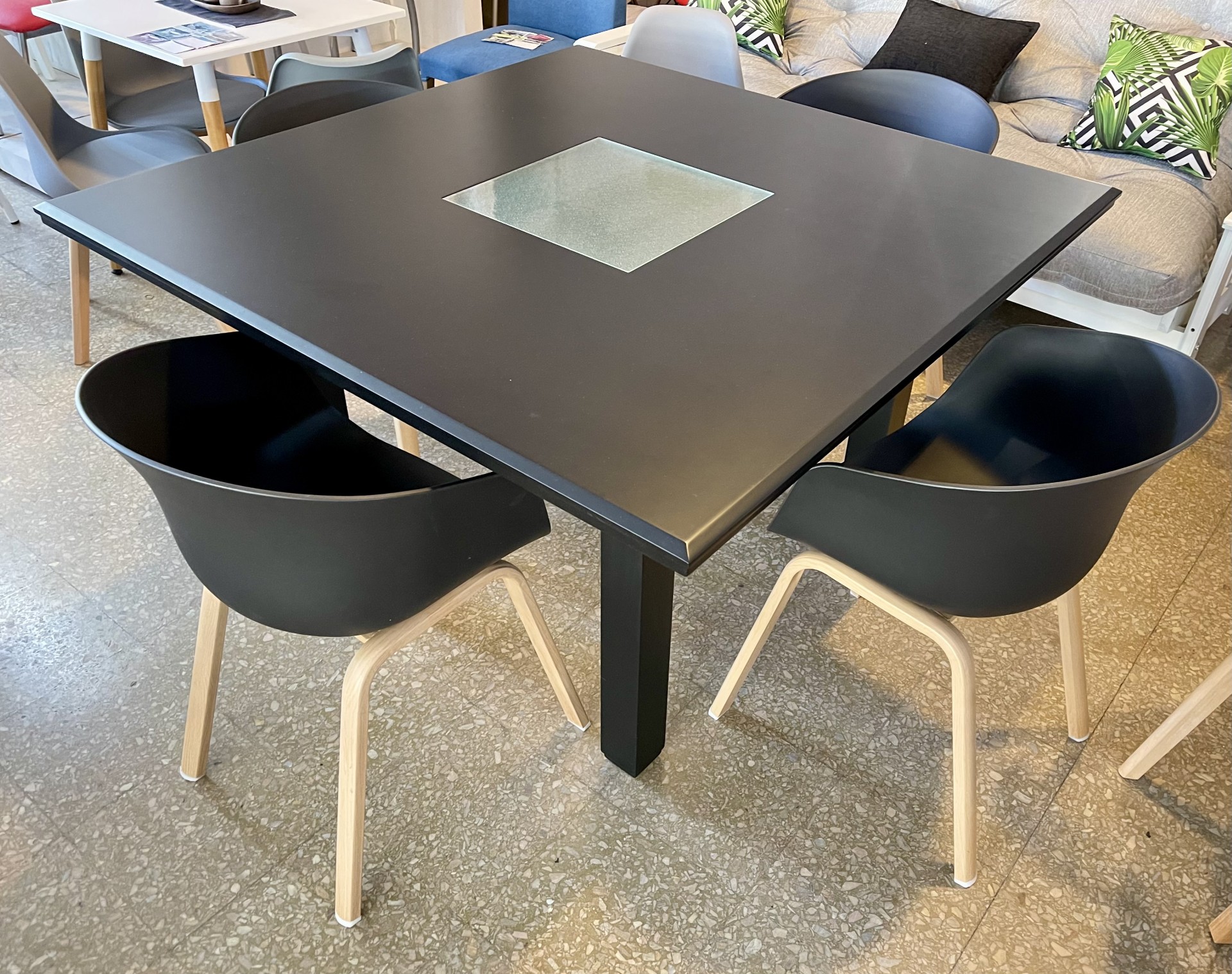 Juego de Mesa Trend 1.30 x 1.30, detalle de vidrio en la tapa, estructura paraíso laqueada negro.
