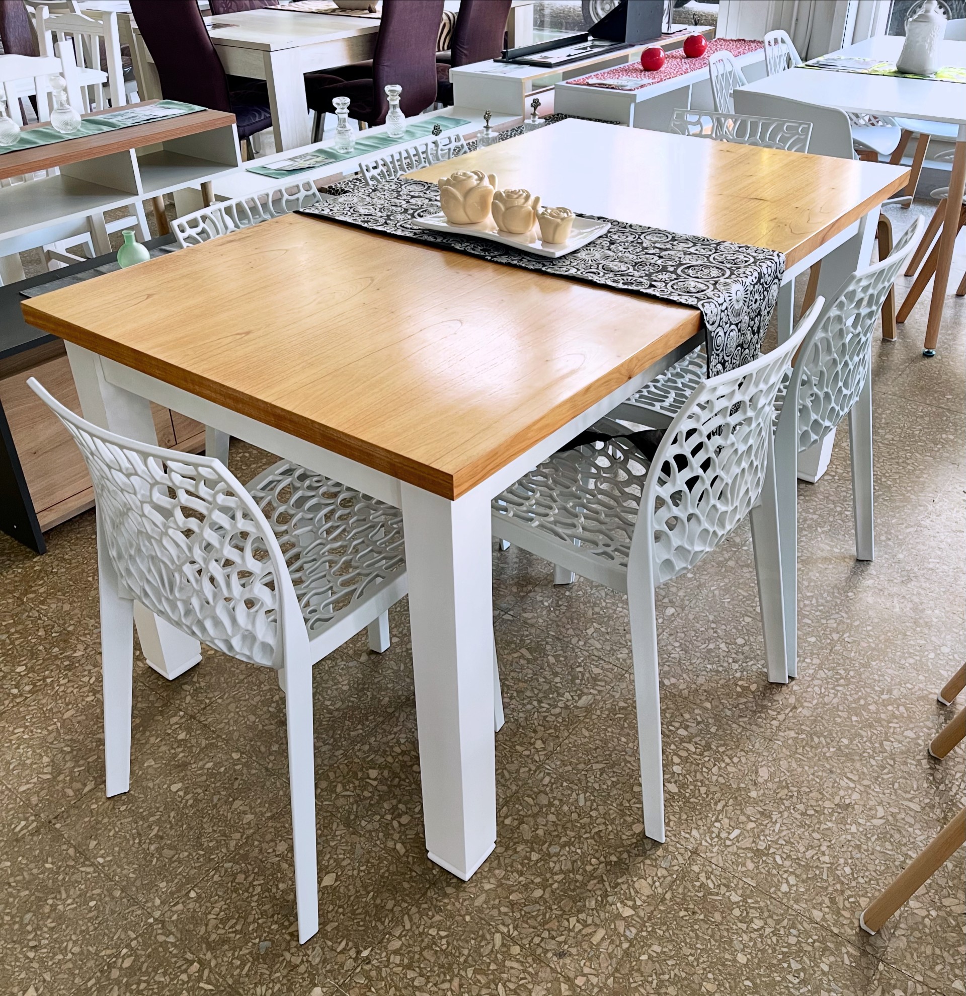 Juego Mesa Trend Tapa Paraíso/Blanco 1.60 x 0.90 + 6 Sillas Mikonos Blancas