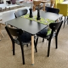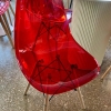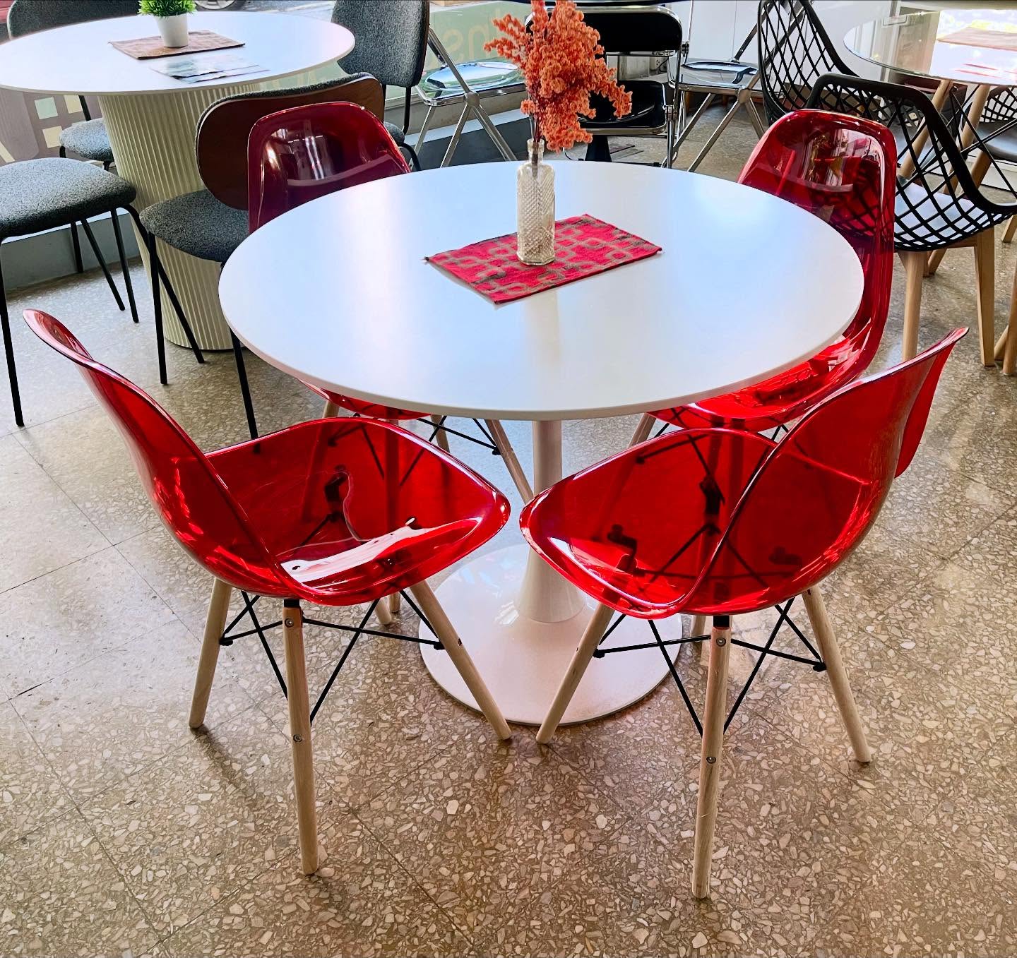 Juego Mesa Tulip Blanca 0.90 diam. + 4 Sillas Eames Glass Rojas