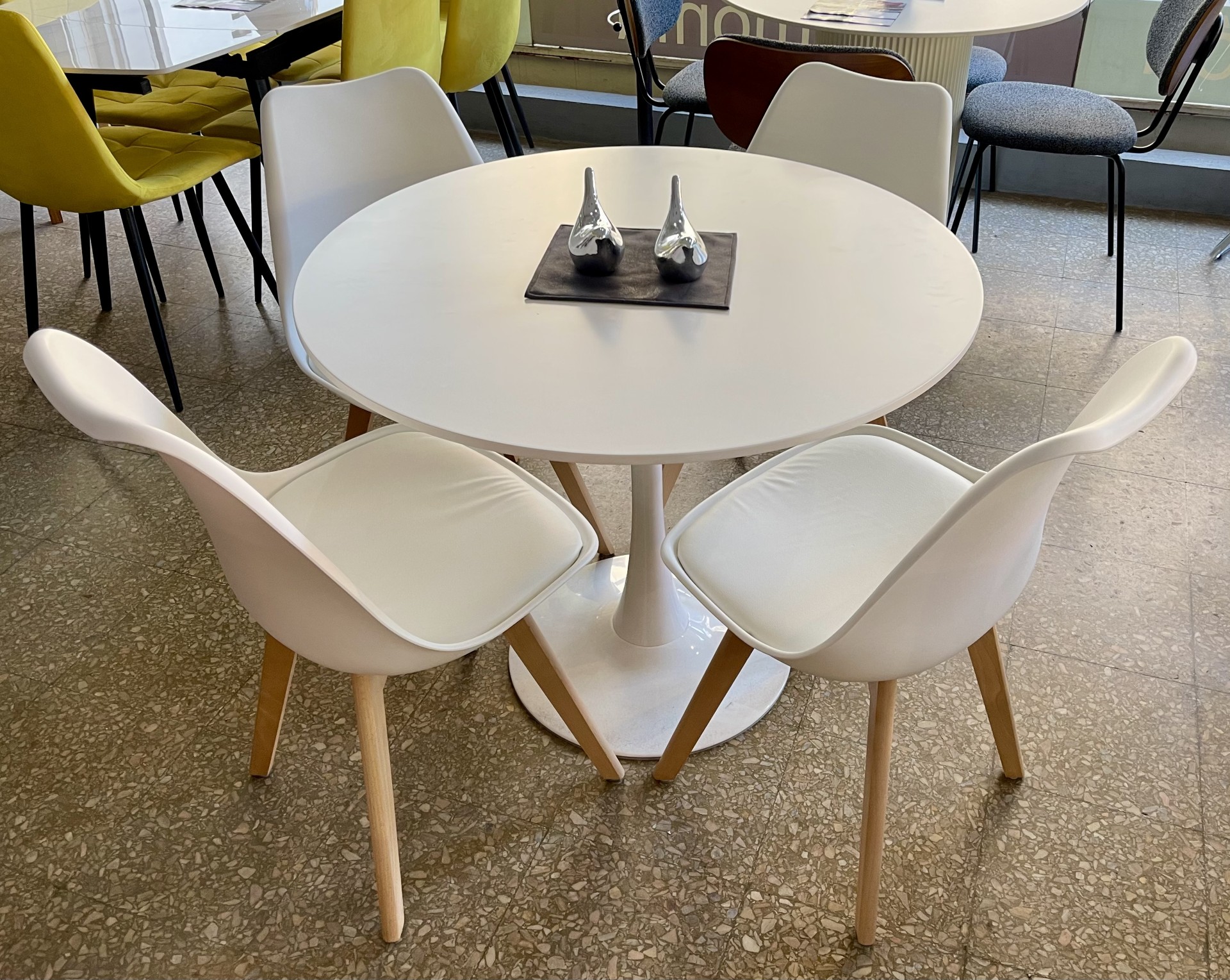 Juego de Mesa Tulip 0.90 diam. base central en metal mate con forma de pedestal, importada, laqueada blanca.