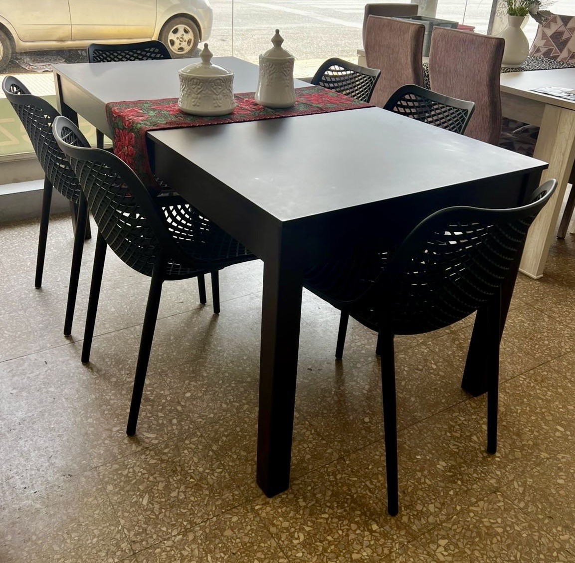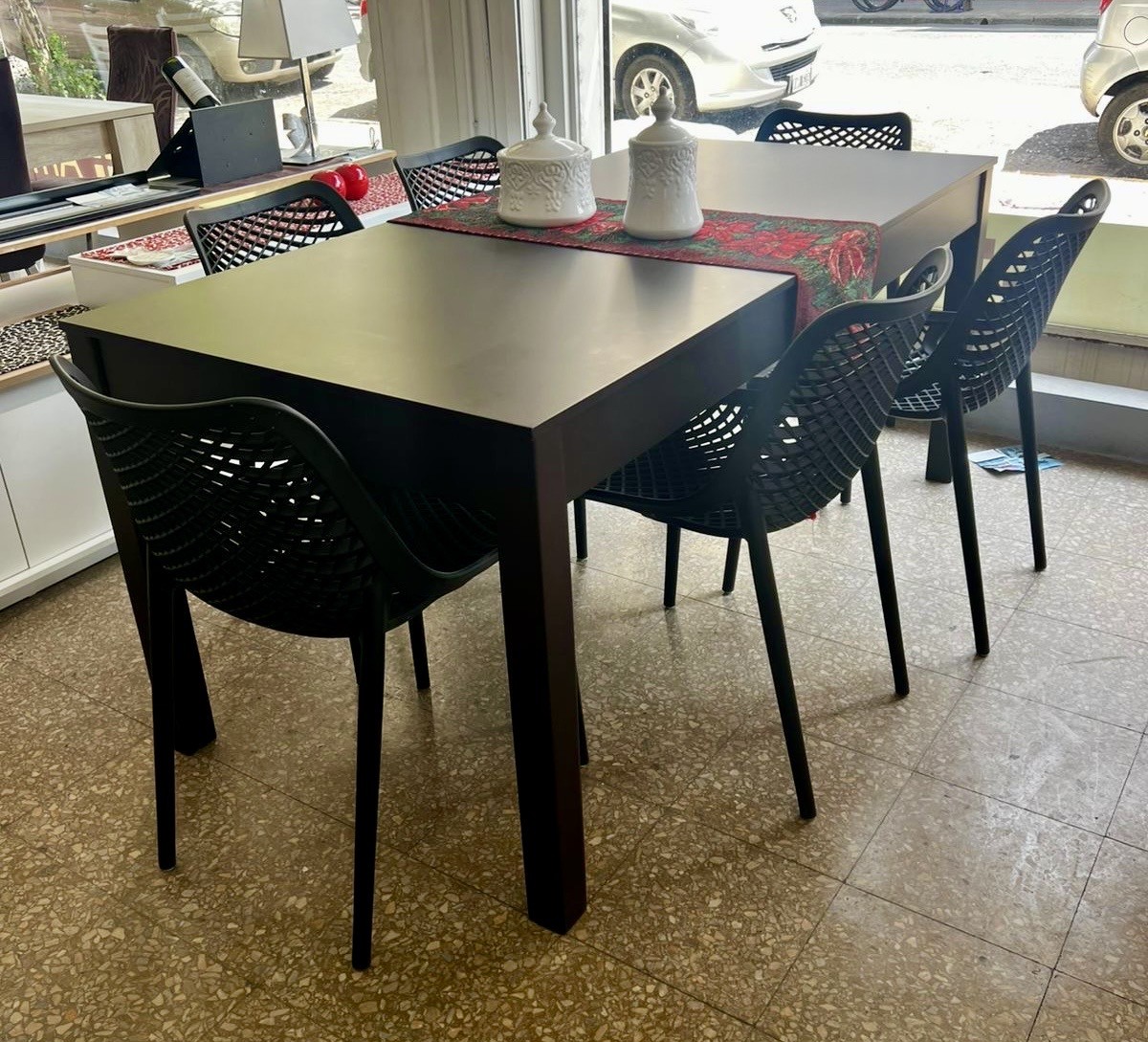 Juego Mesa Zeppelin Extensible Laqueada Chocolate 1.80 x 0.86 a 2.20 + 6 Sillas Varesse Negras