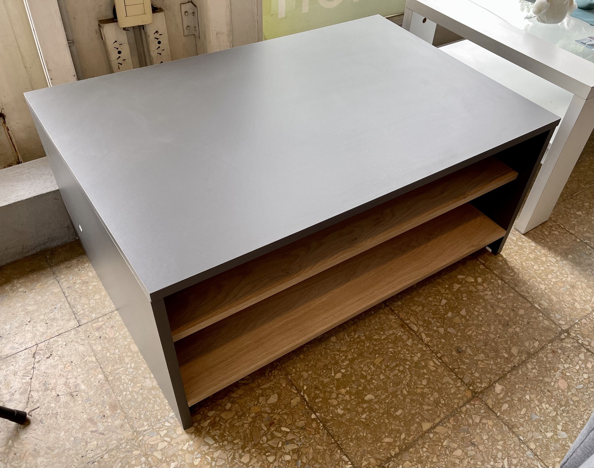 Mesa de Living Niza con 1 estante, confeccionada en melamina gris combinada con roble bardolino.