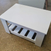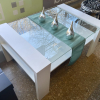 Mesa Ratona Revistera con tapa elevable, detalle de vidrio con escrituras en la tapa, confeccionada en melamina helsinki.