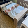 Mesa Ratona Revistera con tapa elevable, detalle de vidrio con escrituras en la tapa, confeccionada en melamina wengue.