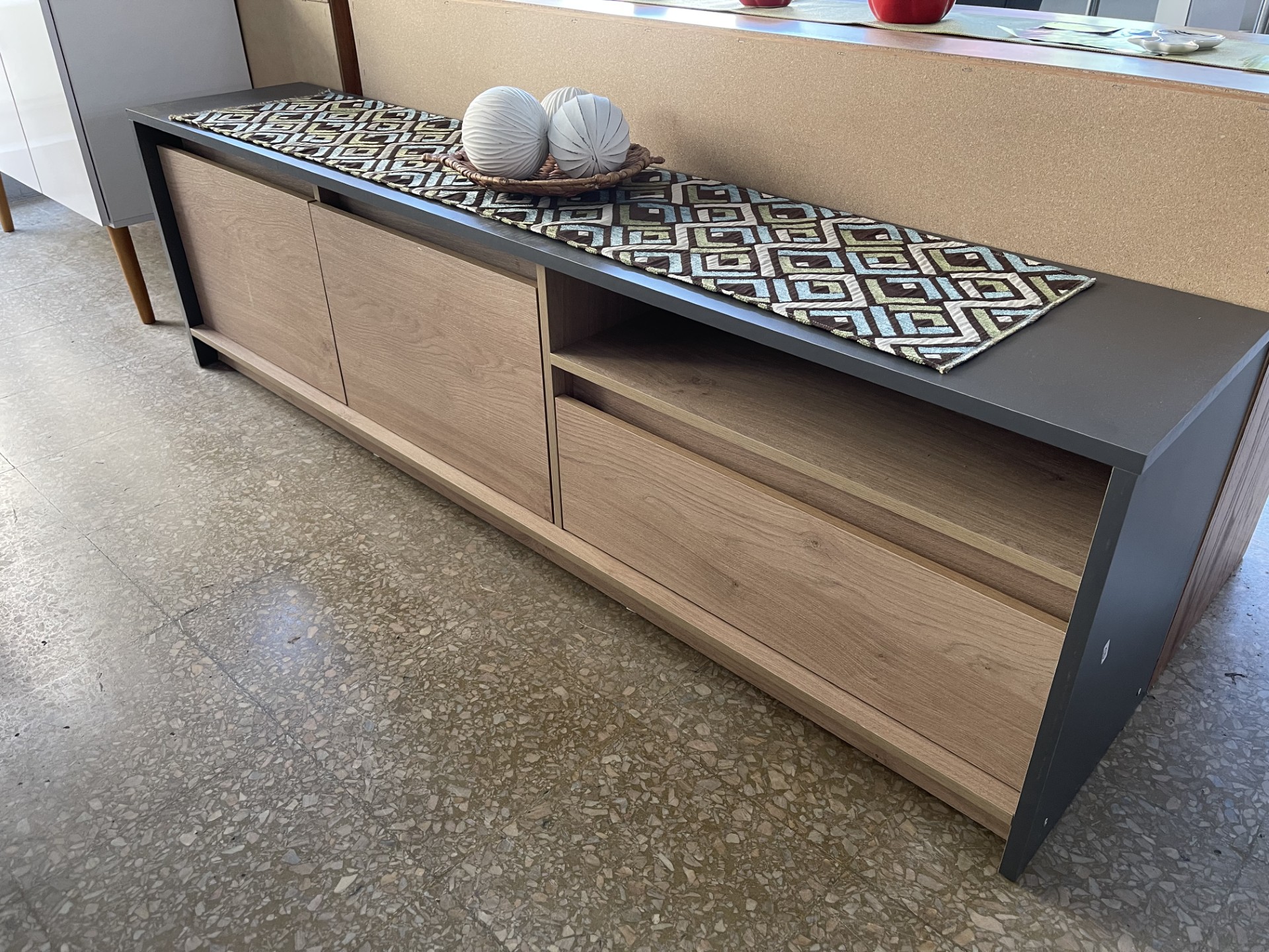 Rack Niza con 2 puertas de abrir con estante interior y 1 cajón con corredera metálica, confeccionado en melamina gris combinada con roble bardolino.
