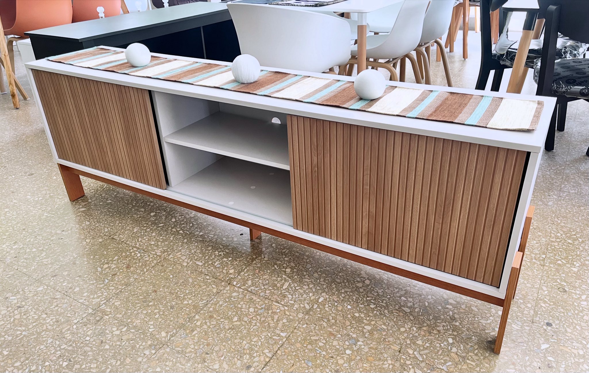 Rack Oslo con 2 puertas corredizas con estante interior, confeccionado en Laqueado uv off whitte/roble.