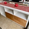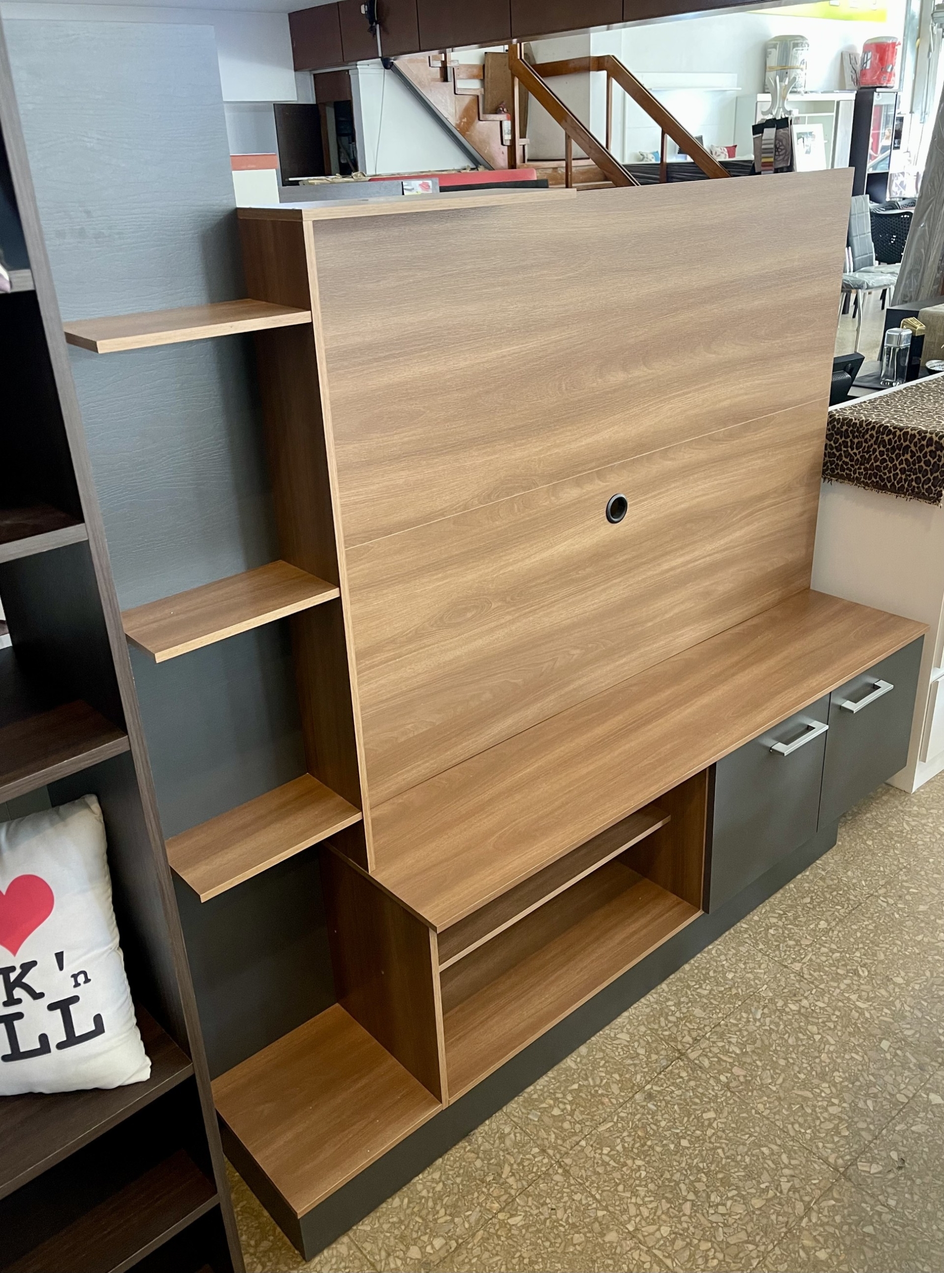 Rack Tokio con 2 puertas de abrir abajo, confeccionado en melamina gris combinado con roble jatoba.