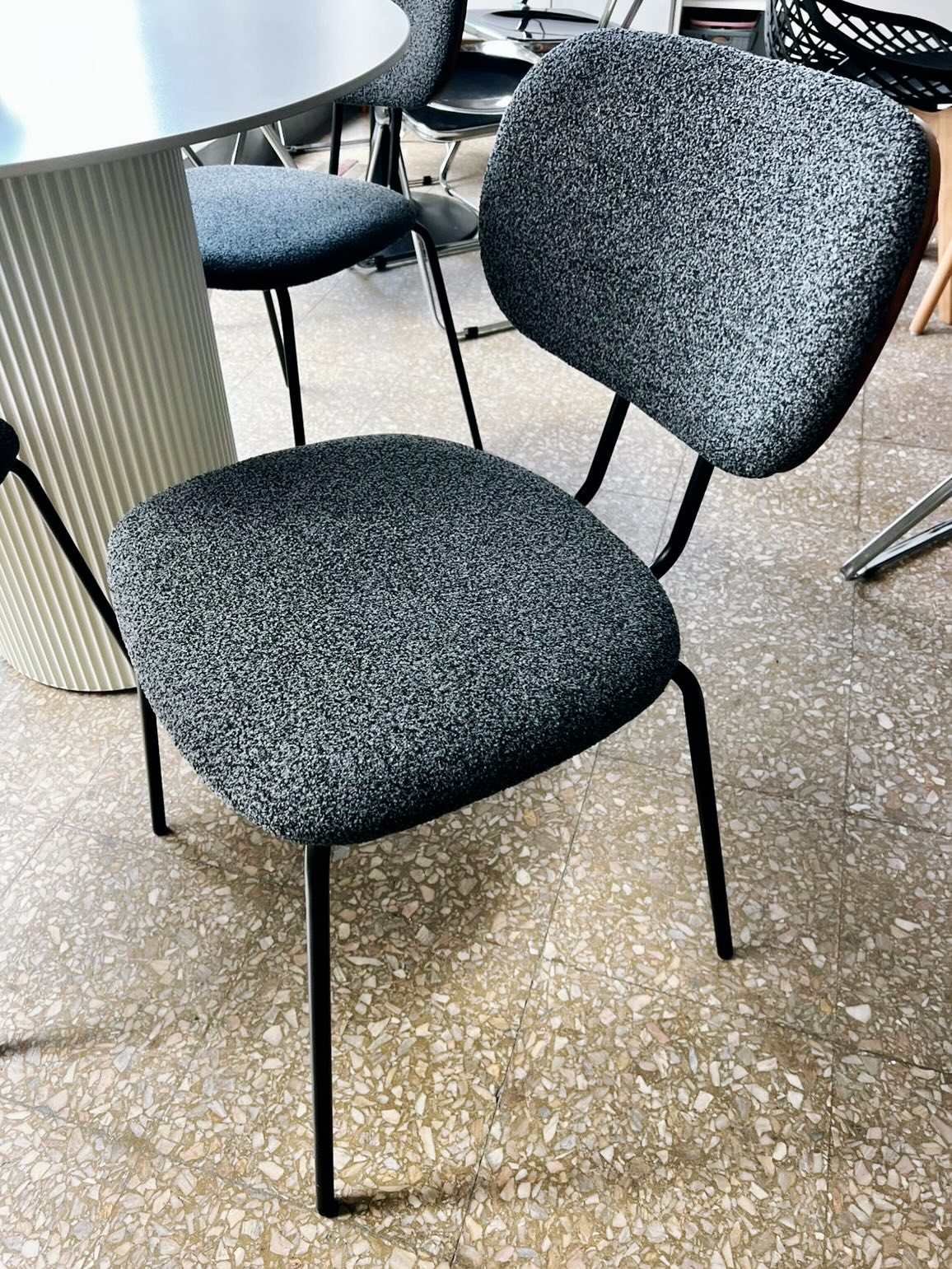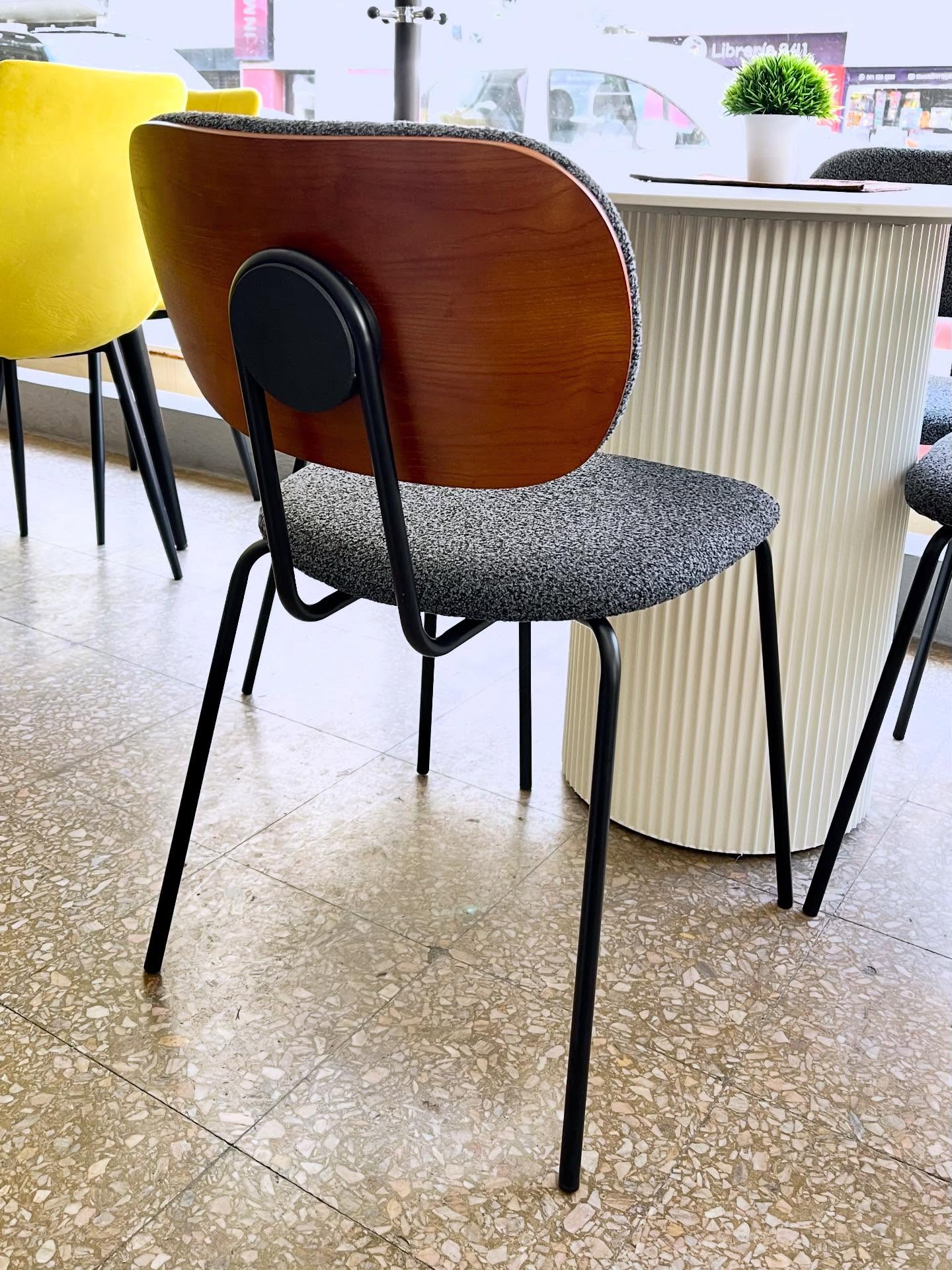 Silla Miller, importada, estructura metálica negra, mini respaldo y asiento acolchado, respaldo curvo enchapado en madera nogal, tapizadas en boucle gris.