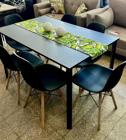 Juego Mesa Zeppelin Extensible Laqueada Chocolate 1.80 x 0.86 a 2.20 + 6 Sillas Varesse Negras